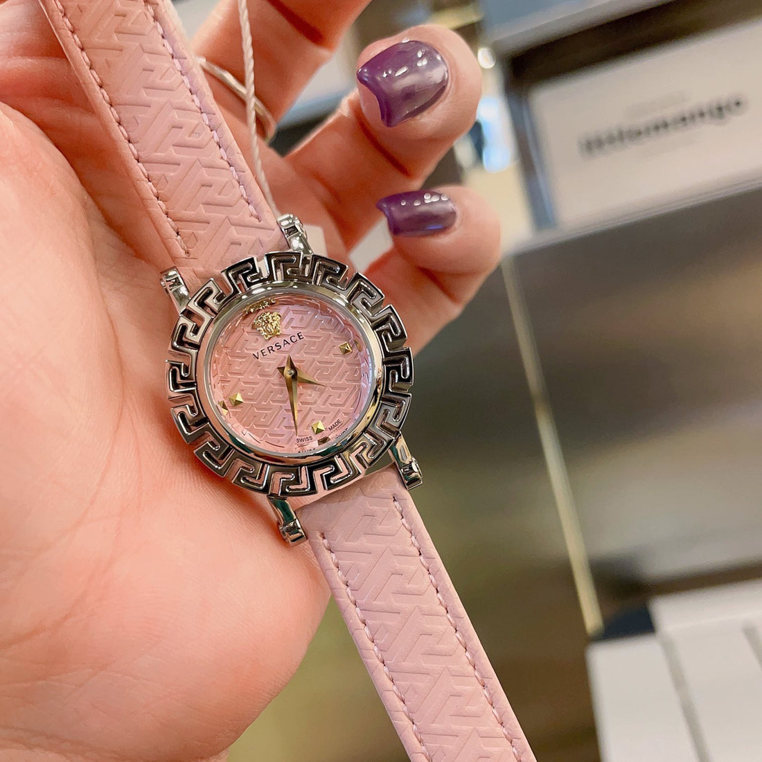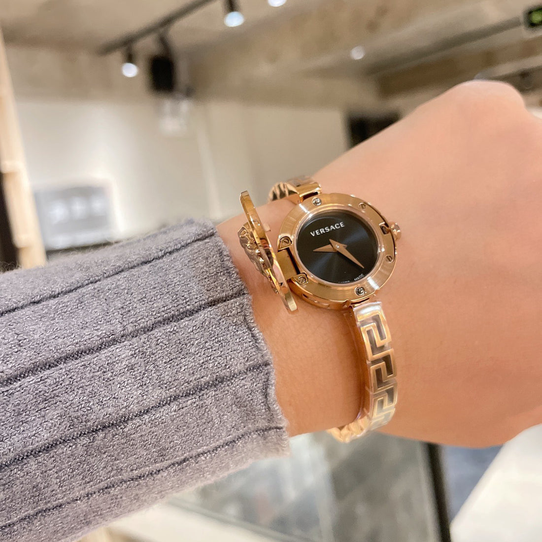 ◆Medusa head at 12 o'clock position with Versace logo below, bezel adorned with Greek key...