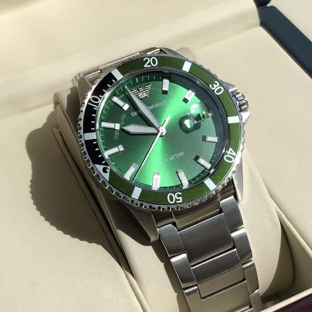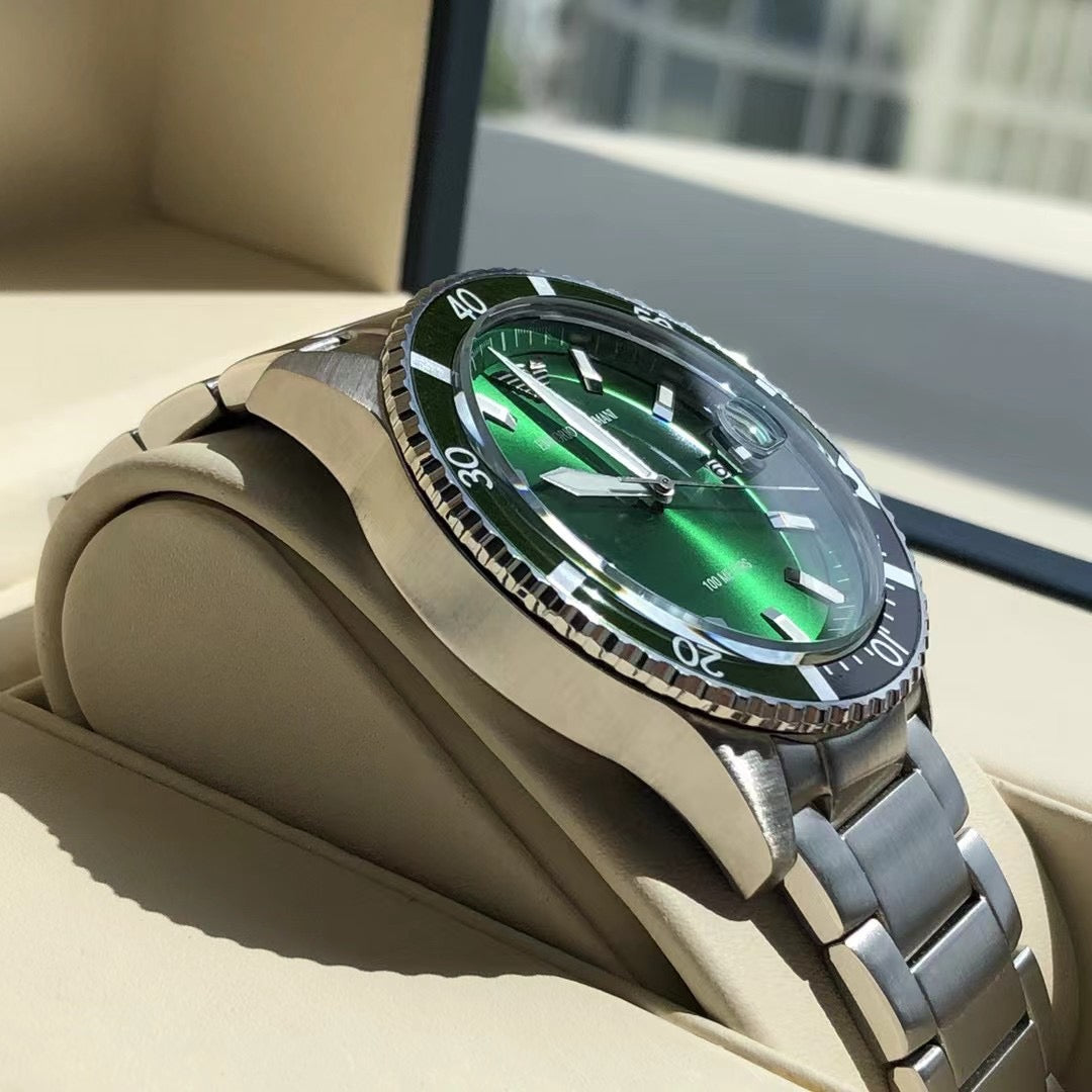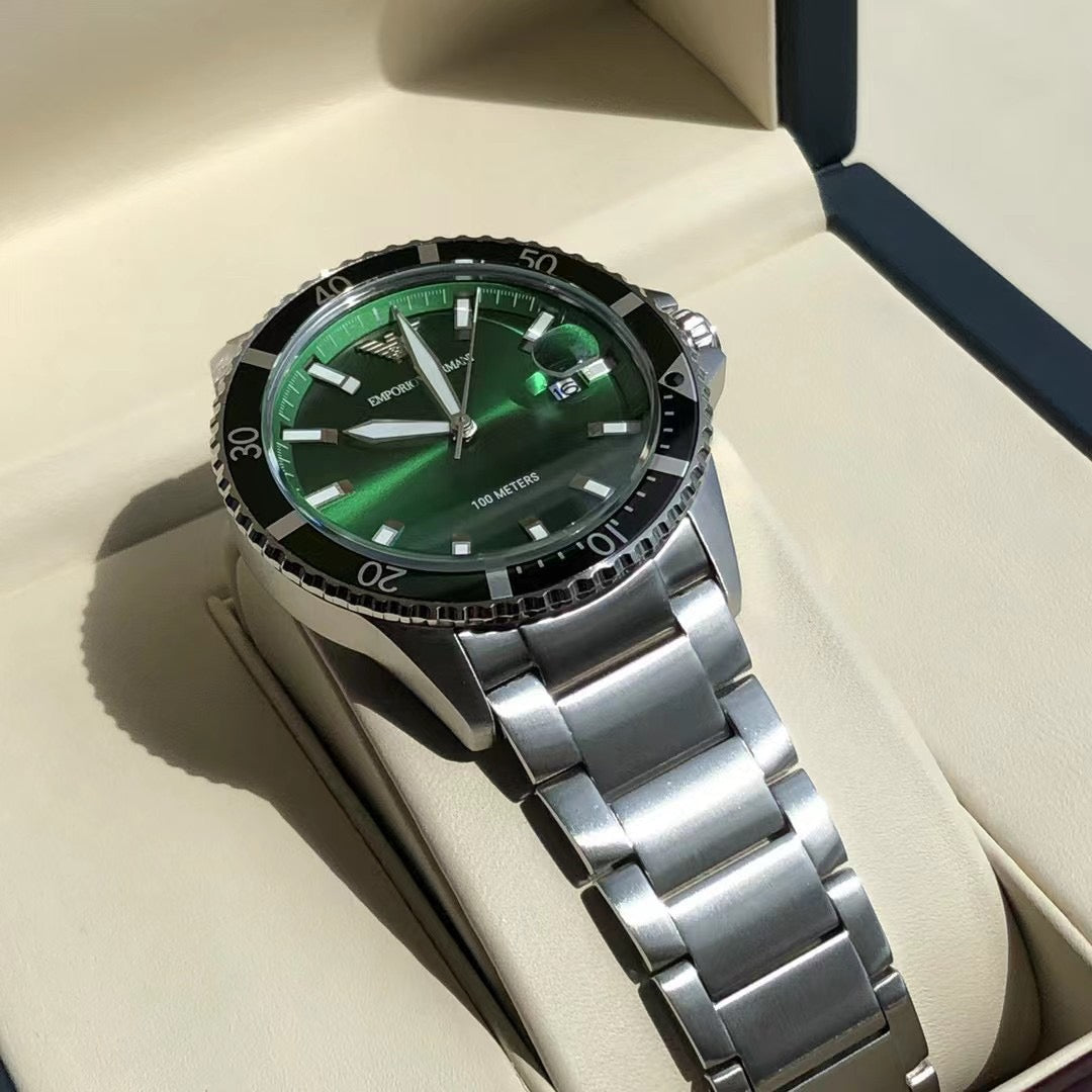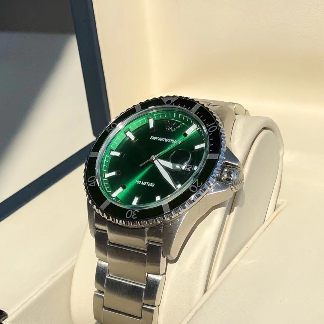 ◆ Business casual European minimalist quartz steel bracelet men's watch. Drawing inspiration from diving, this sporty design features three-hand date display, sunray-brushed bezel, and blue dial. Embodying quality living, it is meticulously crafted with polished finishes that extend the case texture, with every detail showcasing the brand's exceptional quality.