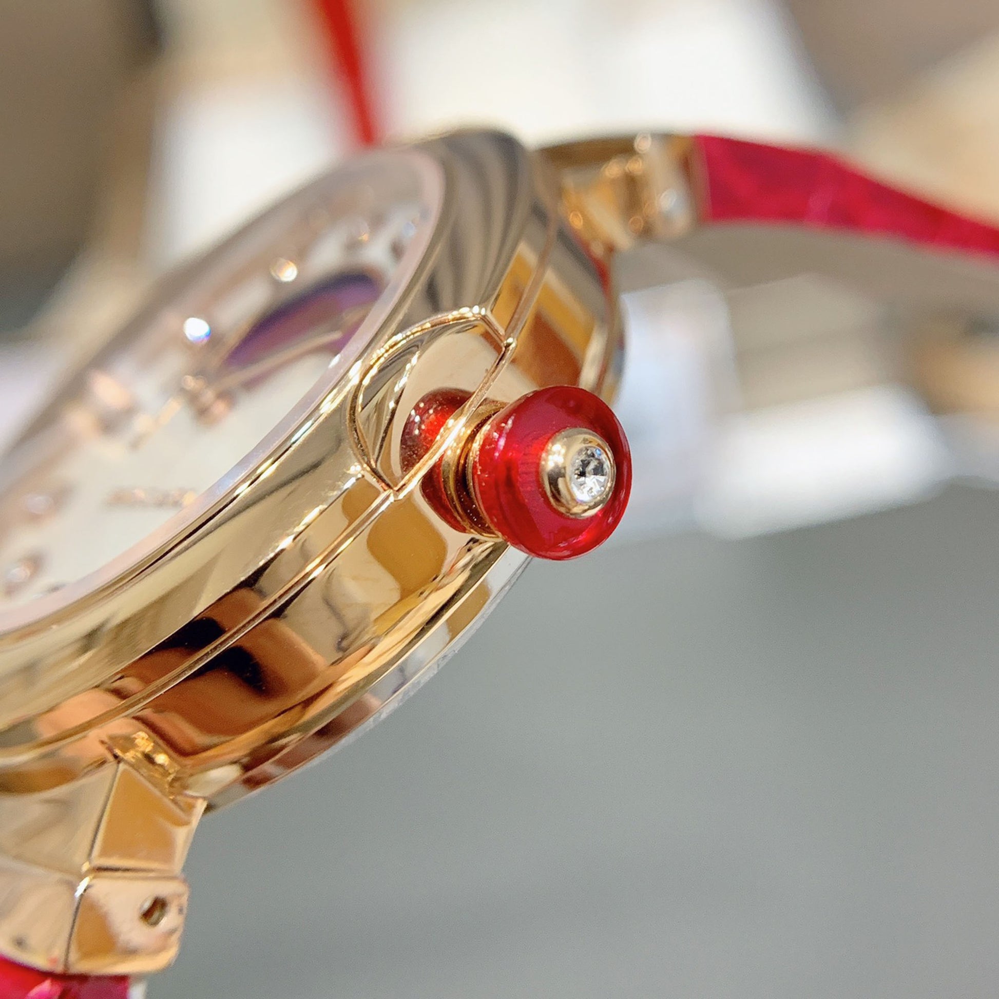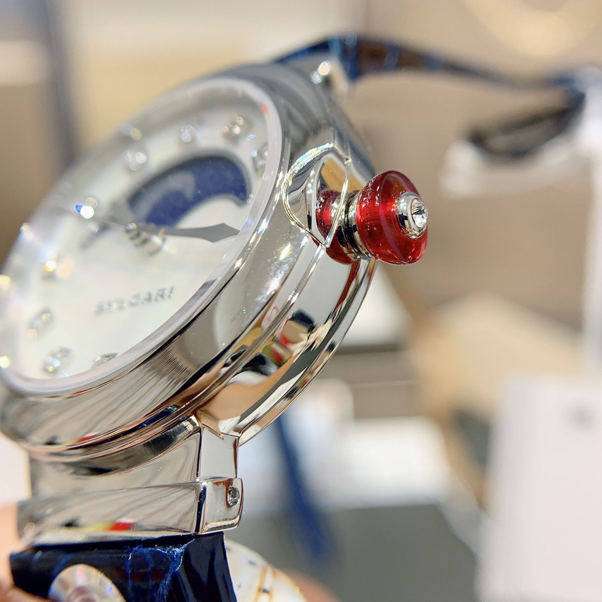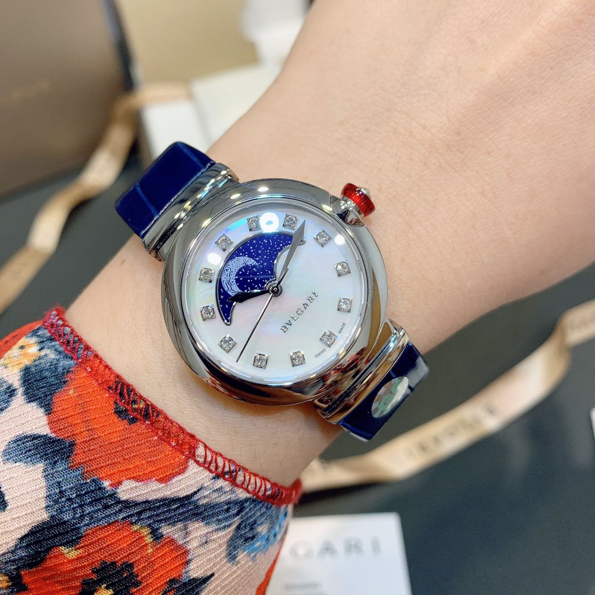 ◆ The curved moon phase display window positioned above the mother-of-pearl dial enhances the watch's visual balance.