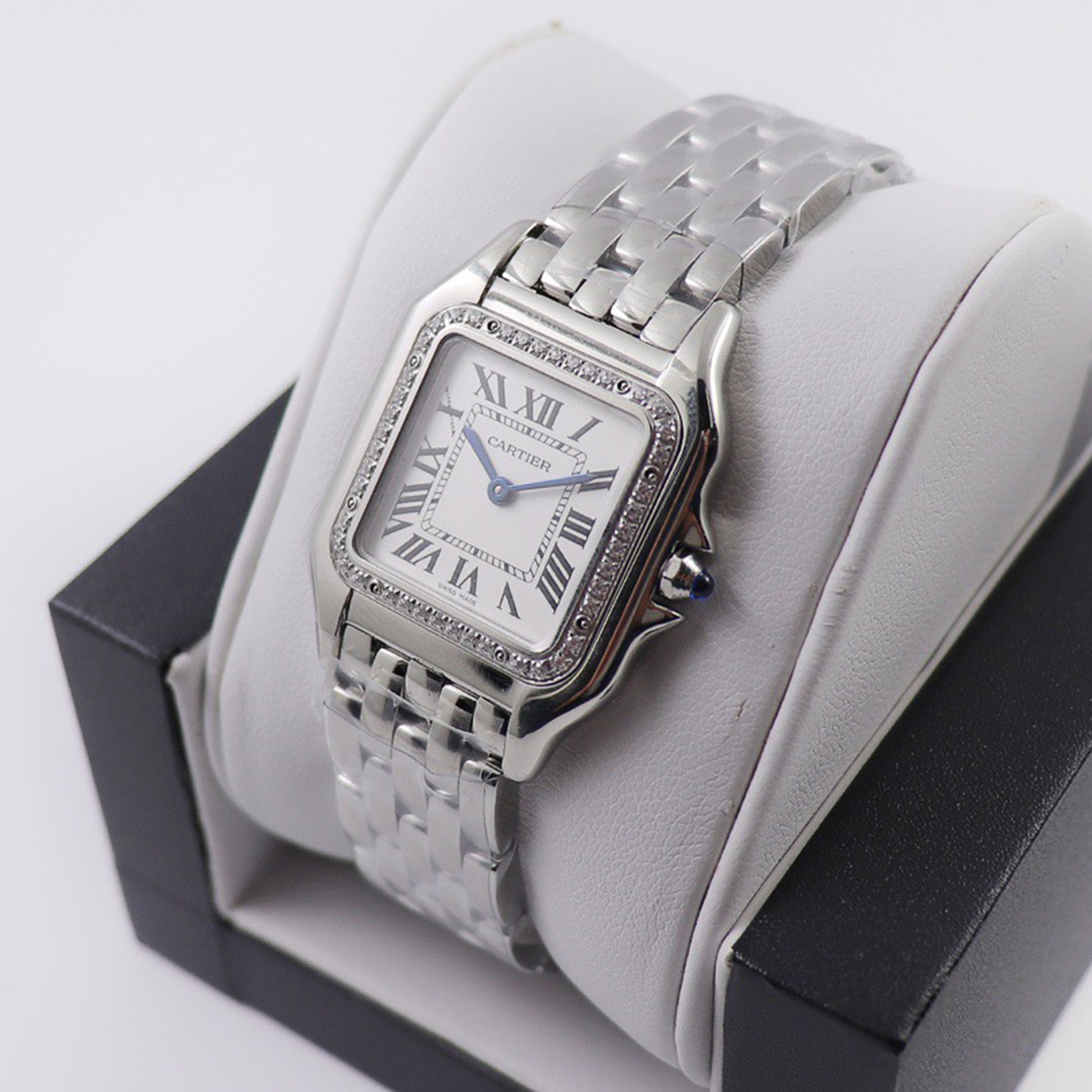 ◆ 316L stainless steel case set with diamonds, crown adorned with a synthetic blue spinel, silver-plated dial, sword-shaped blue-steel hands