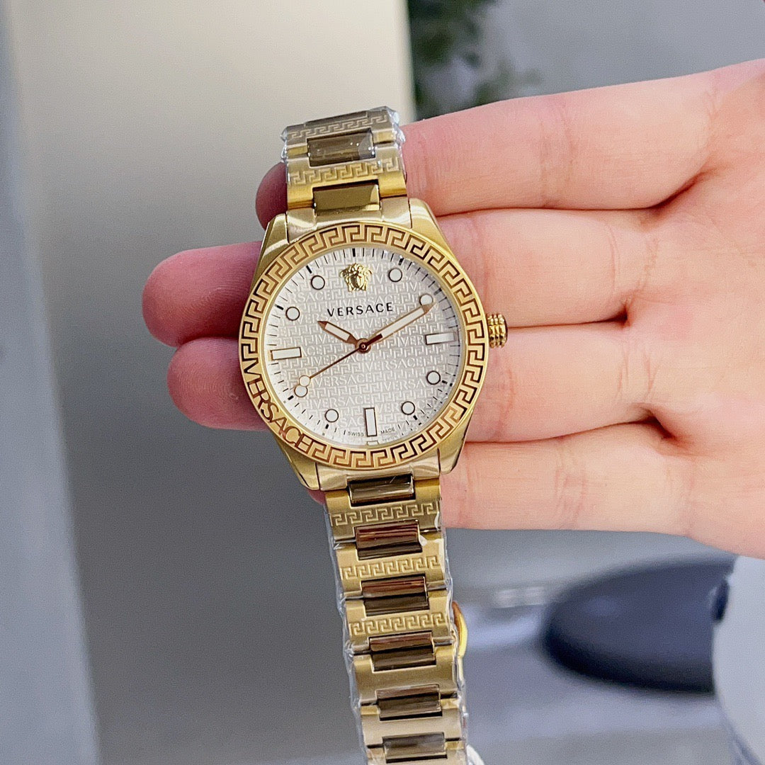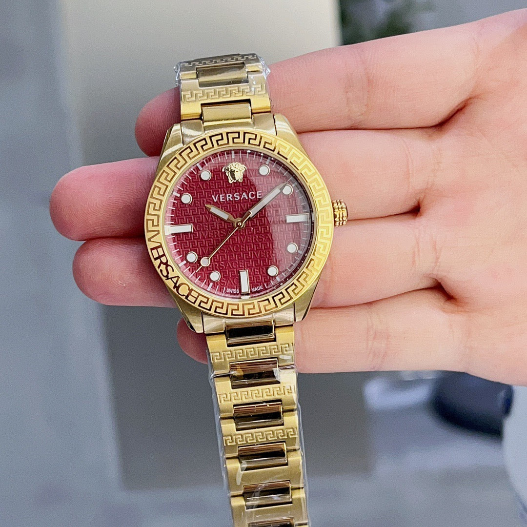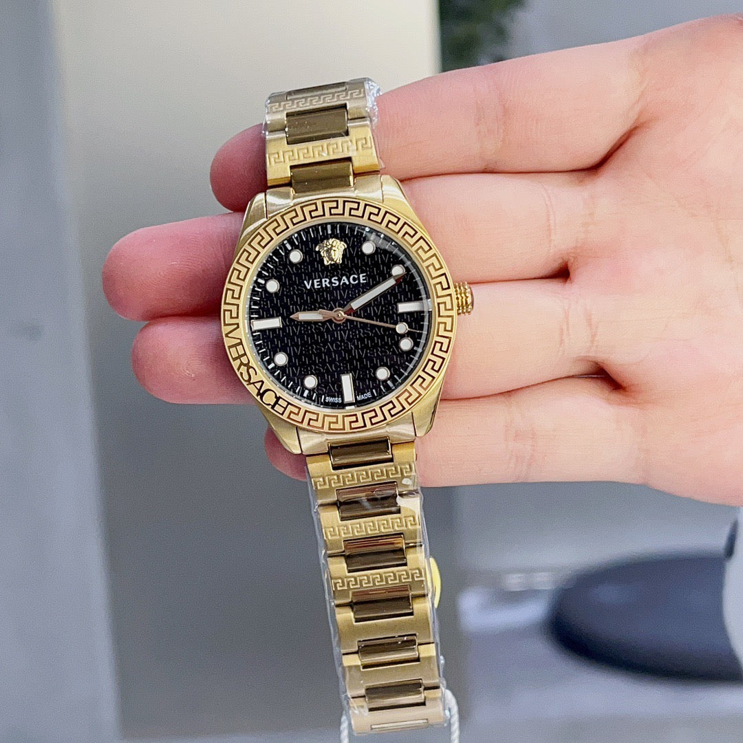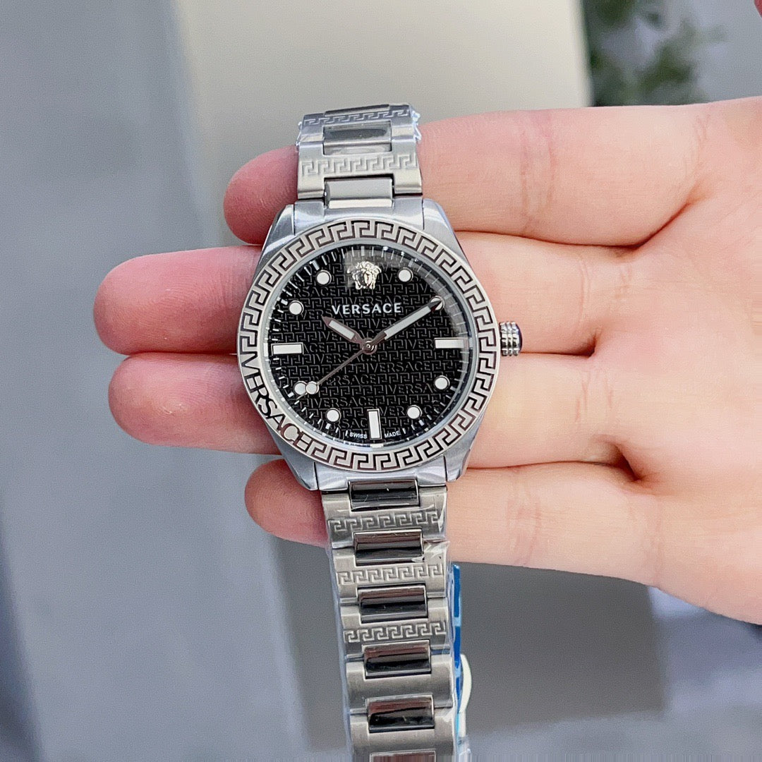 ◆ A contemporary dial with luminous hands and bold hour markers radiates an enigmatic allure after dark. The dome-shaped crystal and Greek key pattern bezel compose a modern chapter in the Versa*e narrative.