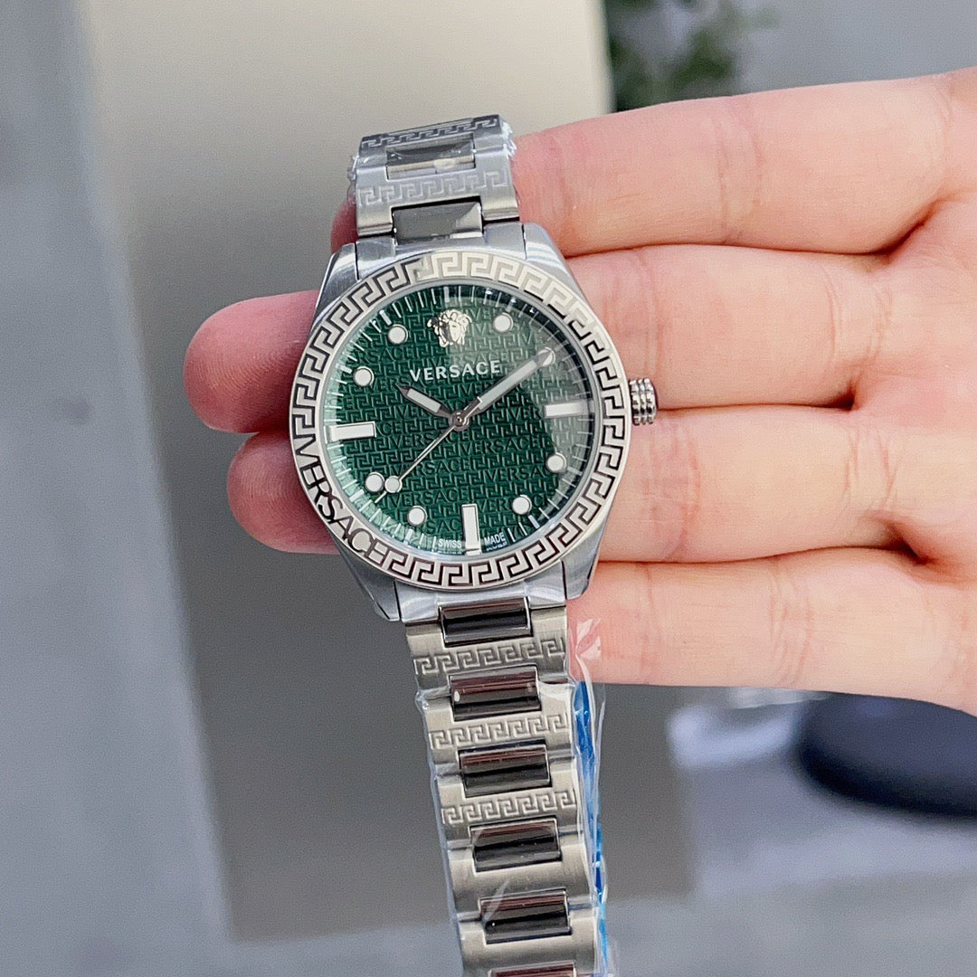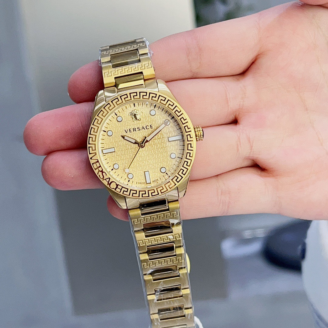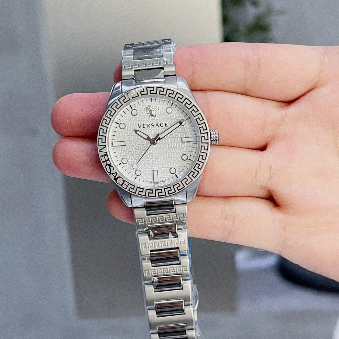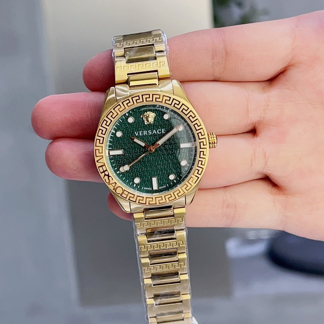 ◆ A contemporary dial with luminous hands and bold hour markers radiates an enigmatic allure after dark. The dome-shaped crystal and Greek key pattern bezel compose a modern chapter in the Versa*e narrative.