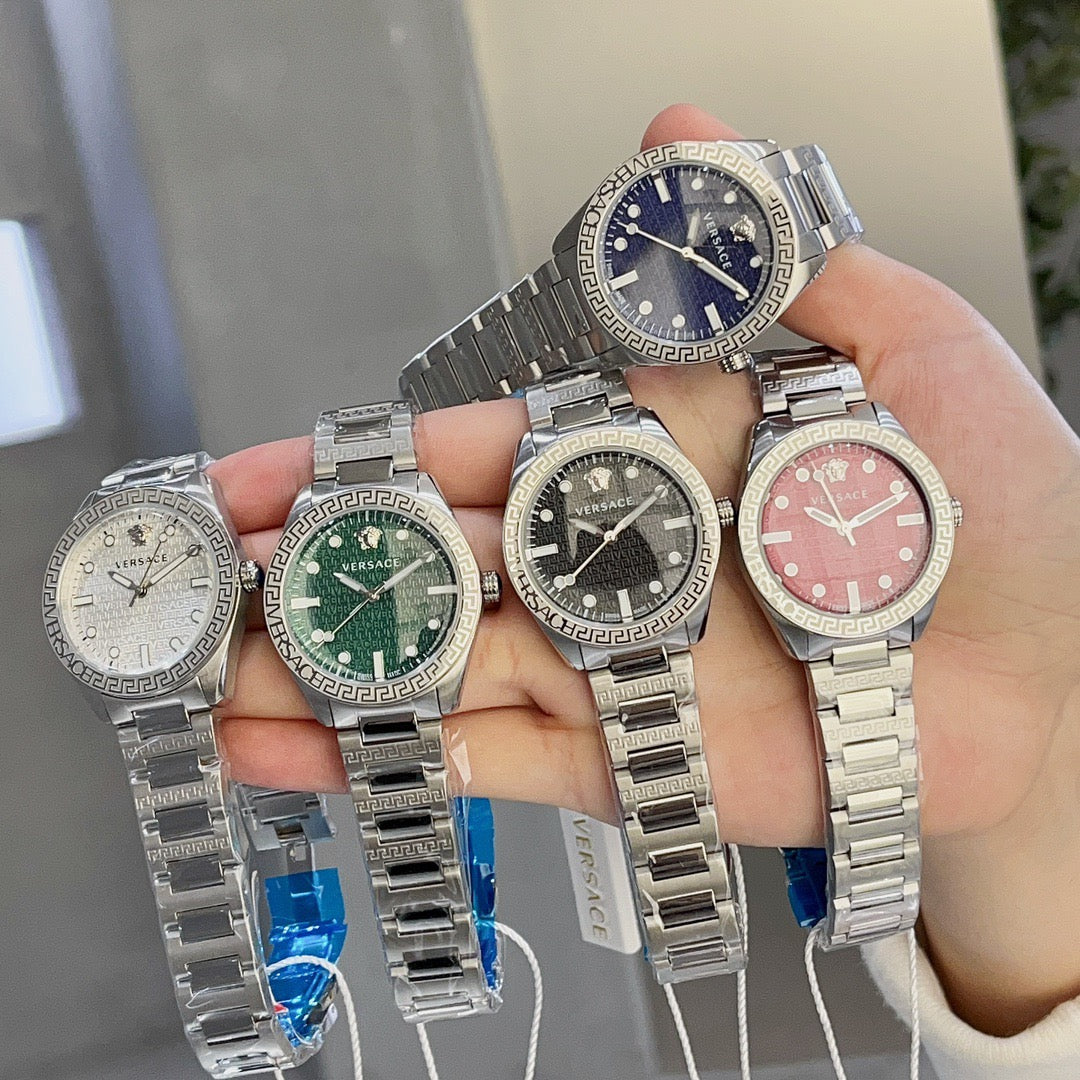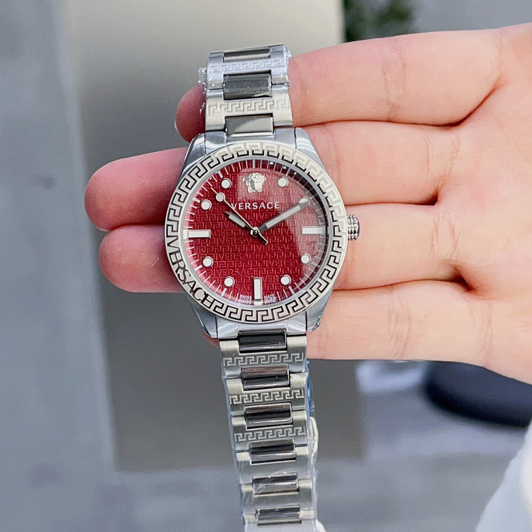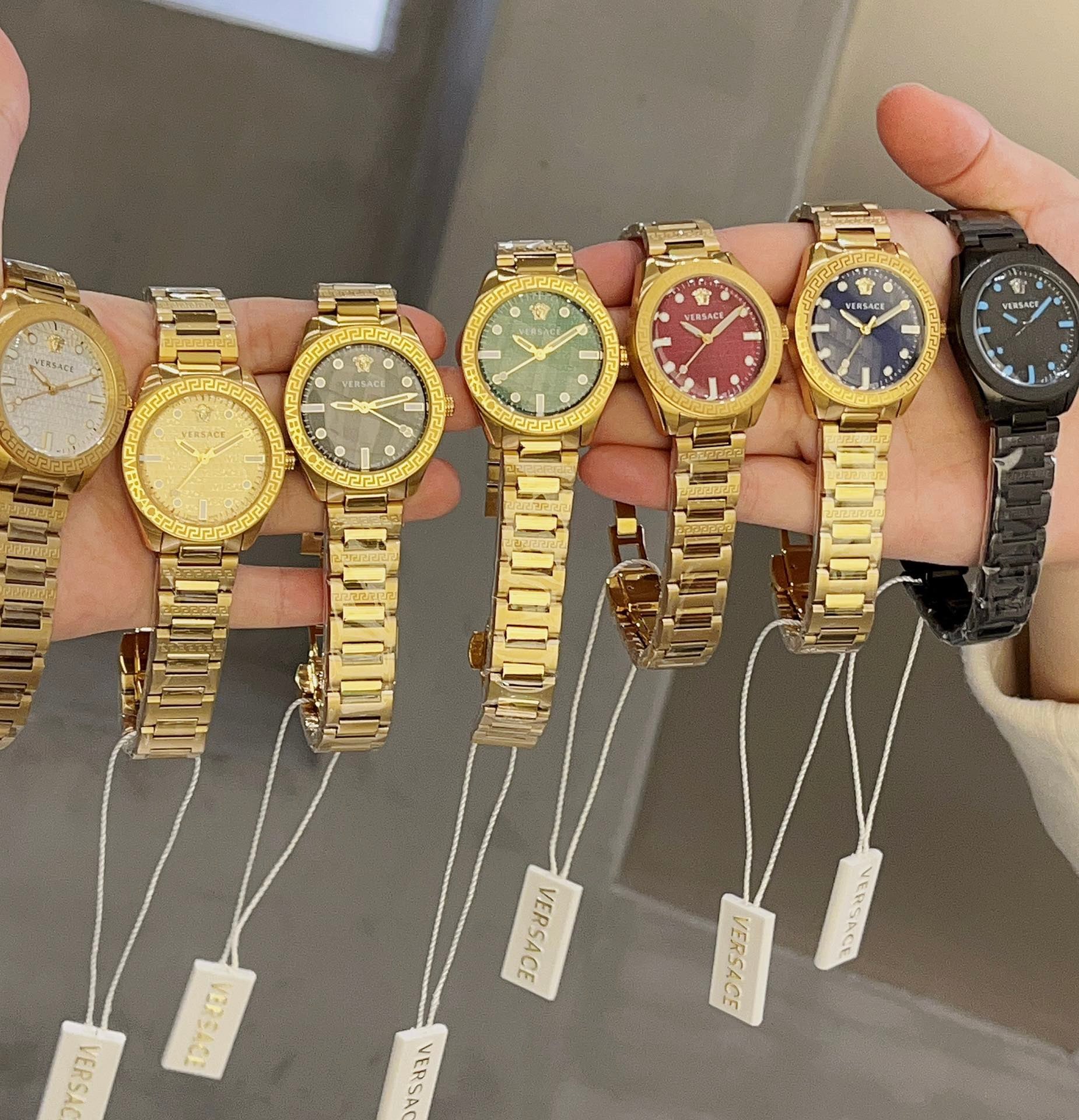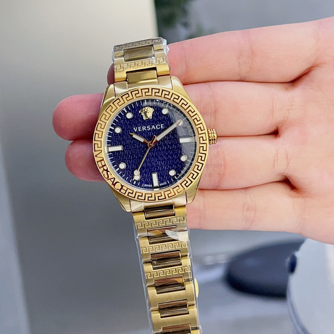 ◆ A contemporary dial with luminous hands and bold hour markers radiates an enigmatic allure after dark. The dome-shaped crystal and Greek key pattern bezel compose a modern chapter in the Versa*e narrative.