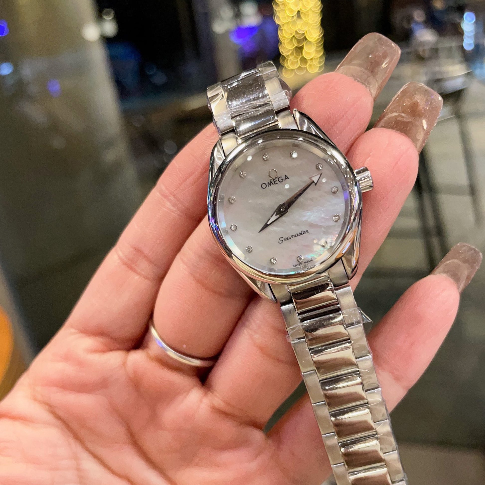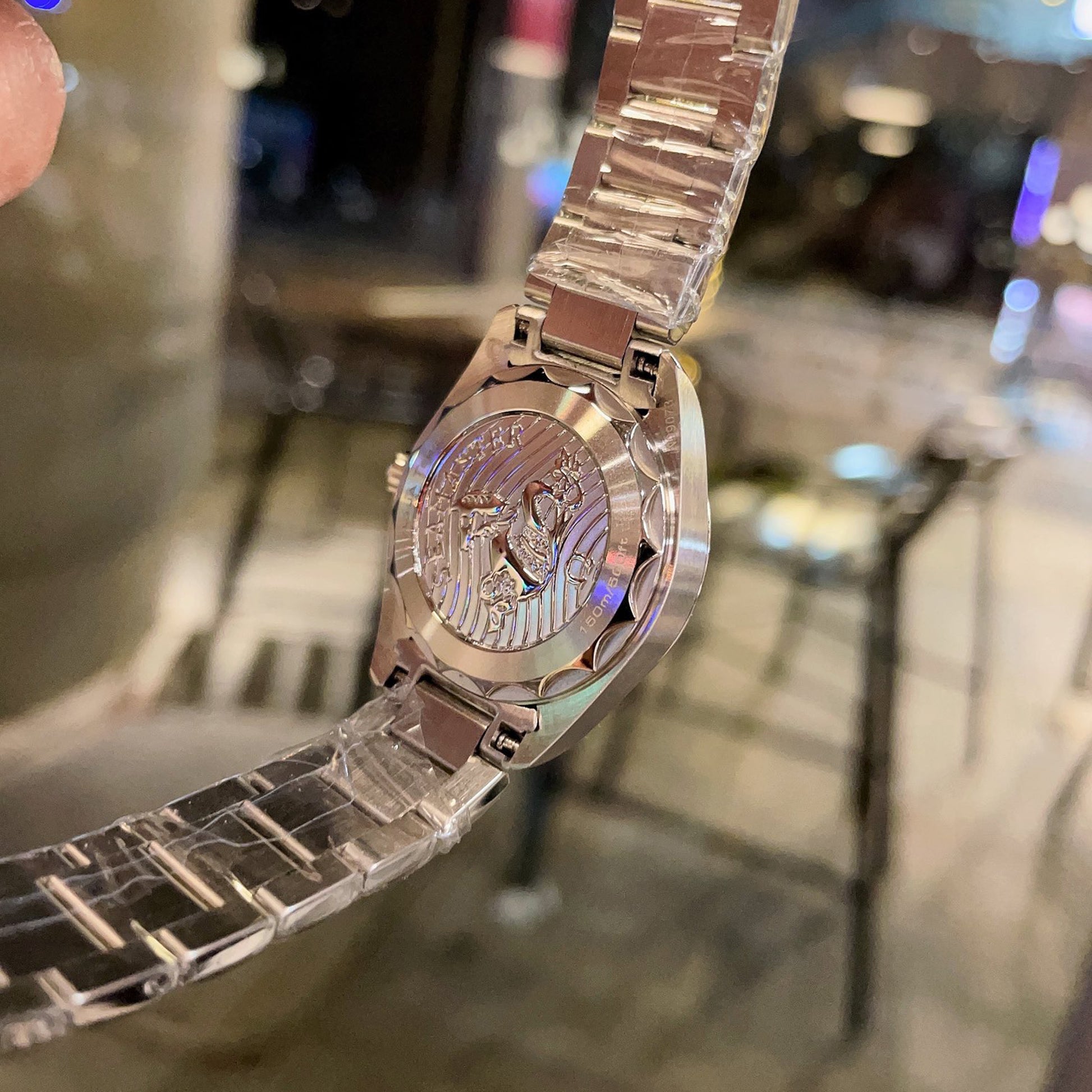 ◆ The caseback displays an engraved Omega Seamaster emblem against a wave-patterned background.